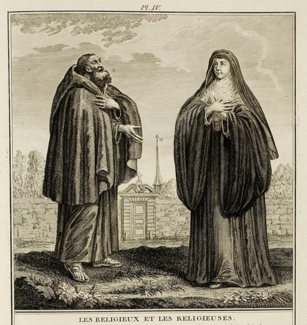 The word Monk means alone: it was given in the early Church to Christians who lived far from the commerce of men, to be particularly sacred to God; several of these Monks, being united, lived under the government of a Superior, at which time they were no longer truly Monks; while the Benedictines and those who live in Abbeys, having kept this denomination, they are called Religious Men. Their dress consists of a Tunic and a Hood, the dress most conformed to the voluntary humility of their state. The Capuchins were not very removed from this manner of dress, as can be seen in the figure represented here: they are dressed in a large gown, a cloak, and a hood of a thick grey cloth; they have sandals, wear a beard and a crown of hair. Religious Men possess nothing, they live only on alms; Cloisters used to be protected in men’s Monasteries, which had a hospice to receive strangers, in which secular people were allowed to go, but the prohibition has still persisted for women.