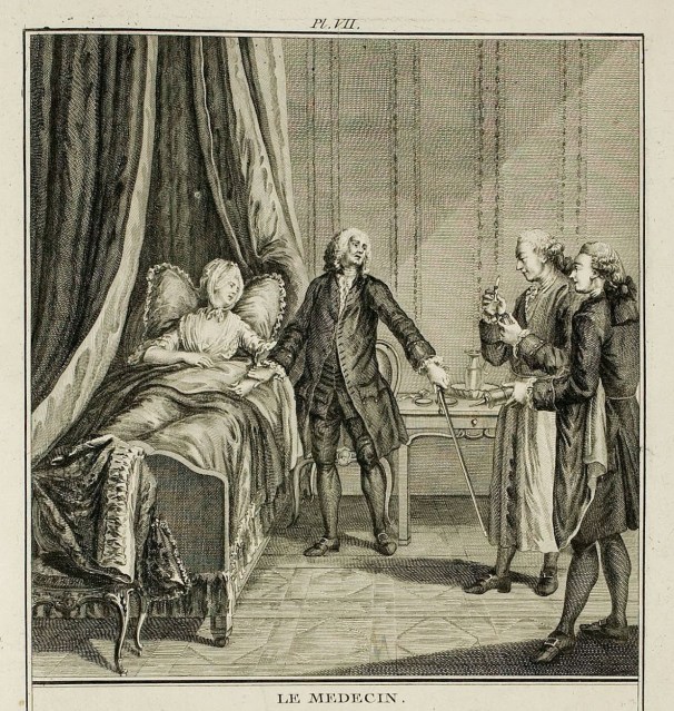 “Honor the Doctor for necessity,” says scripture, good reason, was the response, if the motives are only fear of being killed. This response is unjust, why not say that the desire of being healed is the motive which must engage us, and because of which one must wait for help, when one is infirm, if it is for a wise man, who has made a particular and deep study of the construction and the mechanics of the human body, who has observed all the alterations that the seasons, intemperance, excess of every kind, and the decrepitude of age can bring to health, who has made exact and painstaking research into the means that can be employed to repair it, that is a little cleared without a doubt, who say that the science of the Doctor consists of the uncertain opinions, accredited by experience, of which Patients flatter themselves to prolong their days by his advice, and that the knowledge that he has plants only serves to stun men and to trick them. The discoveries that have been made in the art of healing and their success when applied and practiced, invincibly demonstrate the great obligations that mankind must have to those who become skilled in this art, I mean, to the Doctor, they also have a distinguished rank in society, they are personally noble and by consequence Doctors born gentlemen depart from their nobility, their orders are executed by Apothecaries and Surgeons, the former prepare remedies and administer them; the latter perform all the exterior operations necessary for the health of a patient, such as bleeding, dressing wounds, and in a word in the treatment of Patients all must be subordinate to the Doctor. Hippocrates made this the subject of one of his Aphorisms: Surgeons, Apothecaries, watchers, assistants, all are only auxiliaries, it is only the Doctor that should take the helm, as in the print represented here the Doctor takes the pulse from the hand of a sick Lady and at the same time, he looks at the Surgeon and the Apothecary who listen with attention to his order and who have already one and the other instruments in hand to execute them, they are represented in their hospital garments, that is, in the aprons which must be their uniforms.