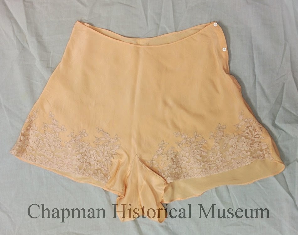 These drawers – tap pants, they’re more commonly called now – were made by a Mrs. Shattuck who ran a “sewing room” in downtown Glens Falls. (The information came from the donor; there’s nothing at all about Mrs. Shattuck that I can find online, although there was a local Shattuck family.) Made of a slippery silk or rayon, they’re entirely hand-sewn with grey silk thread.