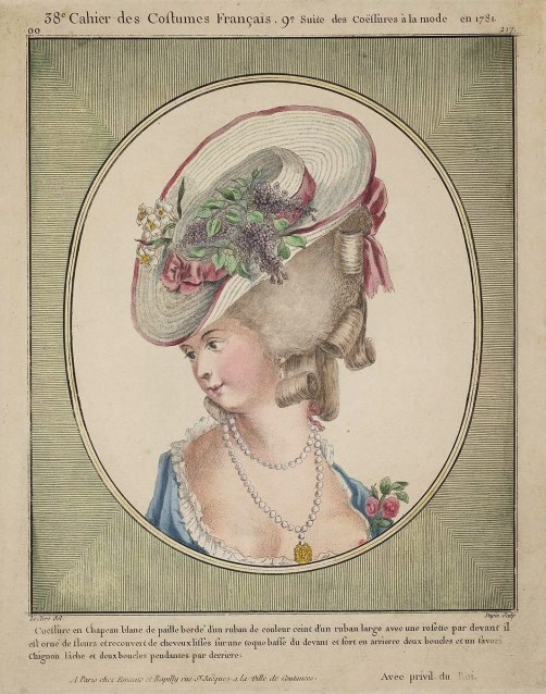 Coiffure of a white straw hat edged with a colored ribbon. Crown surrounded by a wide ribbon, with a bow in the front. It is decorated with flowers and covered with straight hair over a toque which is low in front and larger in the back. Two curls and a favori; loose chignon and two curls hanging in back. (1781)