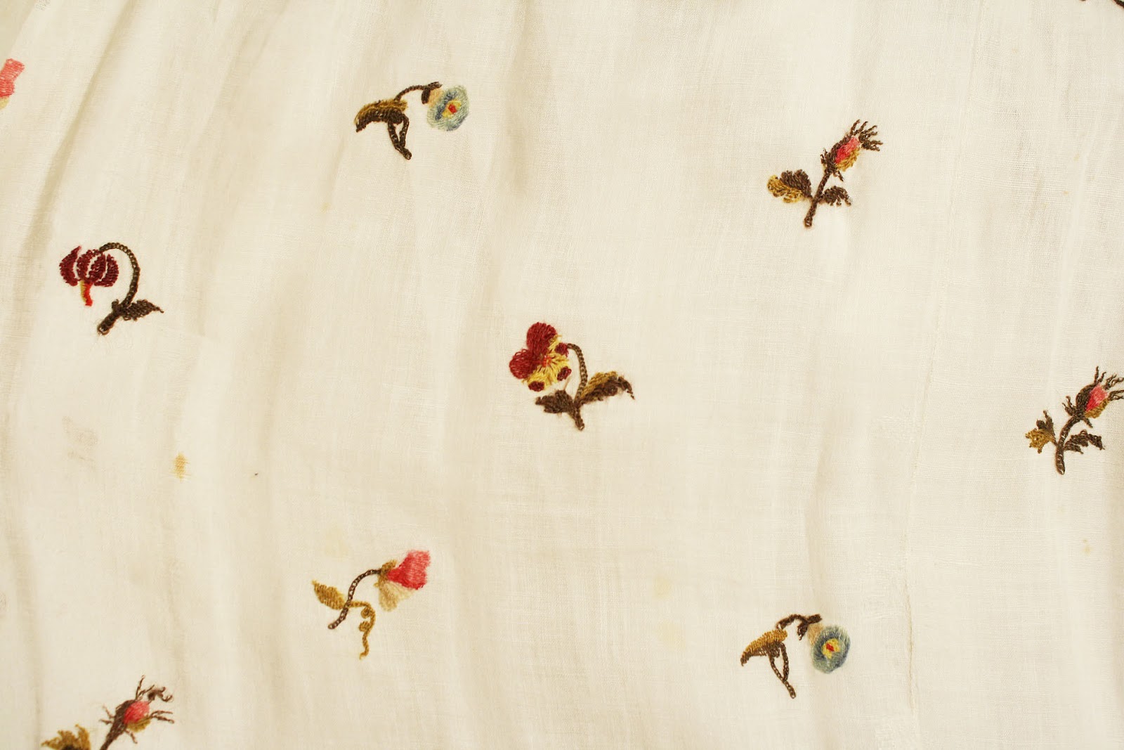 Moving a little more into the interpretive side of things, what about whiteworked cottons? You find gowns made of muslin that were embroidered on the bolt (as opposed to being embroidered after the dress was made up) fairly frequently, especially in the earlier years of the period. Sometimes the motifs are spread apart and sometimes they’re very close together.