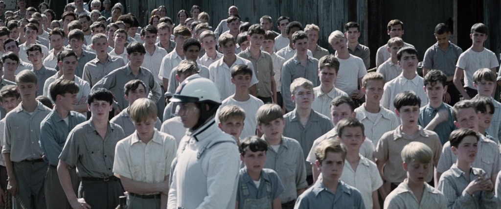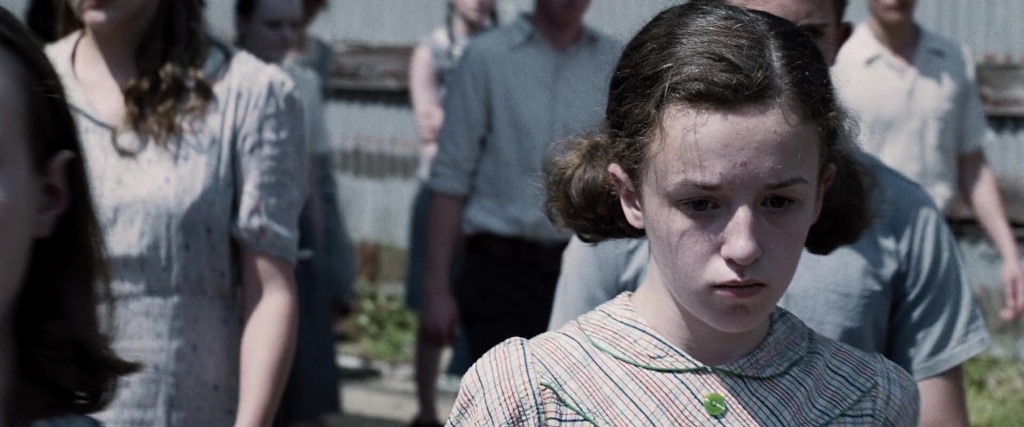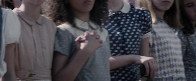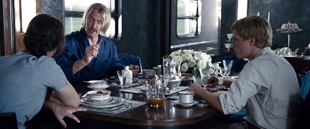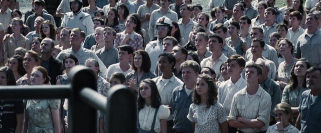 We see clothes that also wouldn’t be out of place in a movie set during the Depression on citizens in all the districts, but we see them in the greatest detail on the people of 12 during the first movie. On girls and women, this generally means high necklines with collars, puffed short sleeves/shoulder emphasis, narrow silhouettes, and bias cuts. For boys and men the effect is less pronounced – buttoning shirts with suspenders – but a short-back-and-sides haircut parted on the side is not common today.