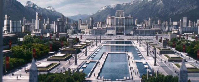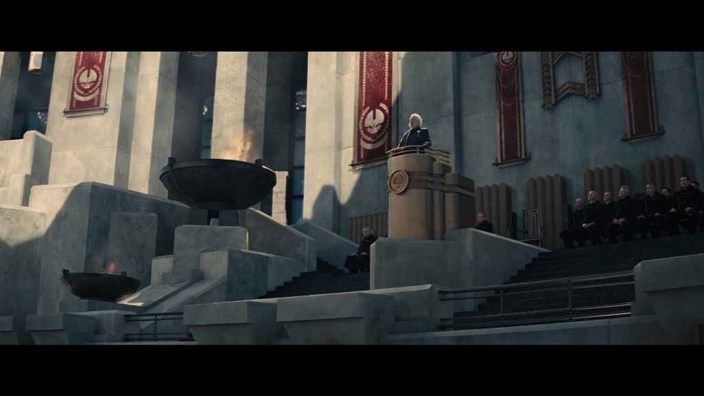 Just as the buildings in District 12 resemble the run-down rural homes of the Depression, the buildings of the Capital are historical references as well. Specifically, they embody the principles of 20th century Fascist architecture, which was based on hard-edged, massive buildings that inspired fear and awe in the viewer, reminding them of the power of Imperial Rome. Being CGI and/or a set means, of course, that they can be taken to an extreme that Mussolini could have only imagined.