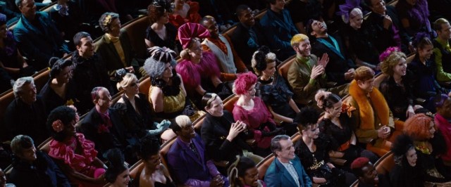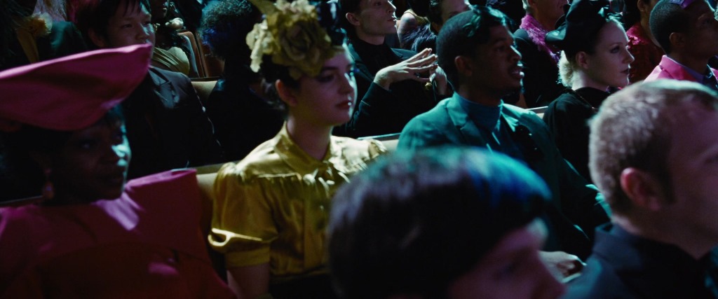 In some of the earlier scenes set in the Capital, we have a huge amount of extras dressed relatively simply. The puffed sleeves seen on young women in District 12 are repeated, and shoulders are a huge focus. (Which can also be seen as a reference to the 1980s, but the ’80s were repeating the ’40s, so.) There are also a lot of hats like Effie’s, brimless and placed toward the front of the head, as well as hats with a vertically-angled brim.