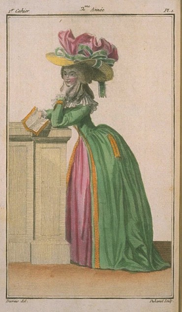 On her head, a straw hat, lined with canary’s tail taffeta or satin, with black stripes, whose very full crown is of pink crêpe, with little black stripes, and which is belted with a wide pale green ribbon, edged in white, pulling up the hat on the right side, holding it inclined on the left side, and forming on this side a large bow, whose ends fall very low in the back.
