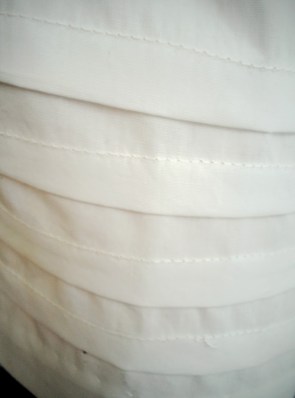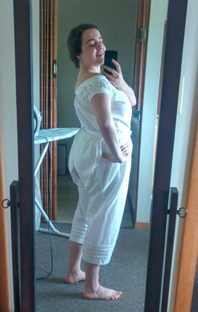 How historically accurate is it? As usual, I’m aiming for high accuracy! The end result looks exactly like extant drawers I’ve handled in museum collections, although my tucks are maybe a little bigger. Next time I do any tucked underthings, I’m going to aim for 3/8″ instead of 1/2″, and I should have done the gathers by hand instead of by machine (both for accuracy and, because I have a Tension Problem, the fabric was really hard to gather after doing the two lines of stitching). But if I didn’t have confidence that this long-legged diaper was historically accurate, would I show you how completely unflattering it is?