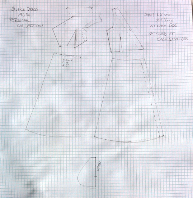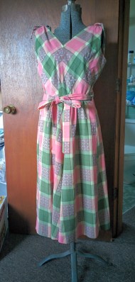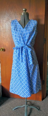 I forget how I first found out about Swirl dresses, but I realized fairly quickly that that was exactly what I needed for throwing on after work in the summer. (This was last year. I’m a slow mover.) The clothing company L. Nachman & Son went into business in the early 20th century, and started making the “Neat’n’Tidy” pinafore apron before 1940; in 1944 they created the “Swirl” wraparound apron, which soon developed into a dress, somewhere between a housedress and an ordinary day dress in formality. You can see a number of extant Swirl dresses and advertisements from the 1940s through 1960s at FuzzieLizzie Vintage Clothing and The Vintage Traveler.