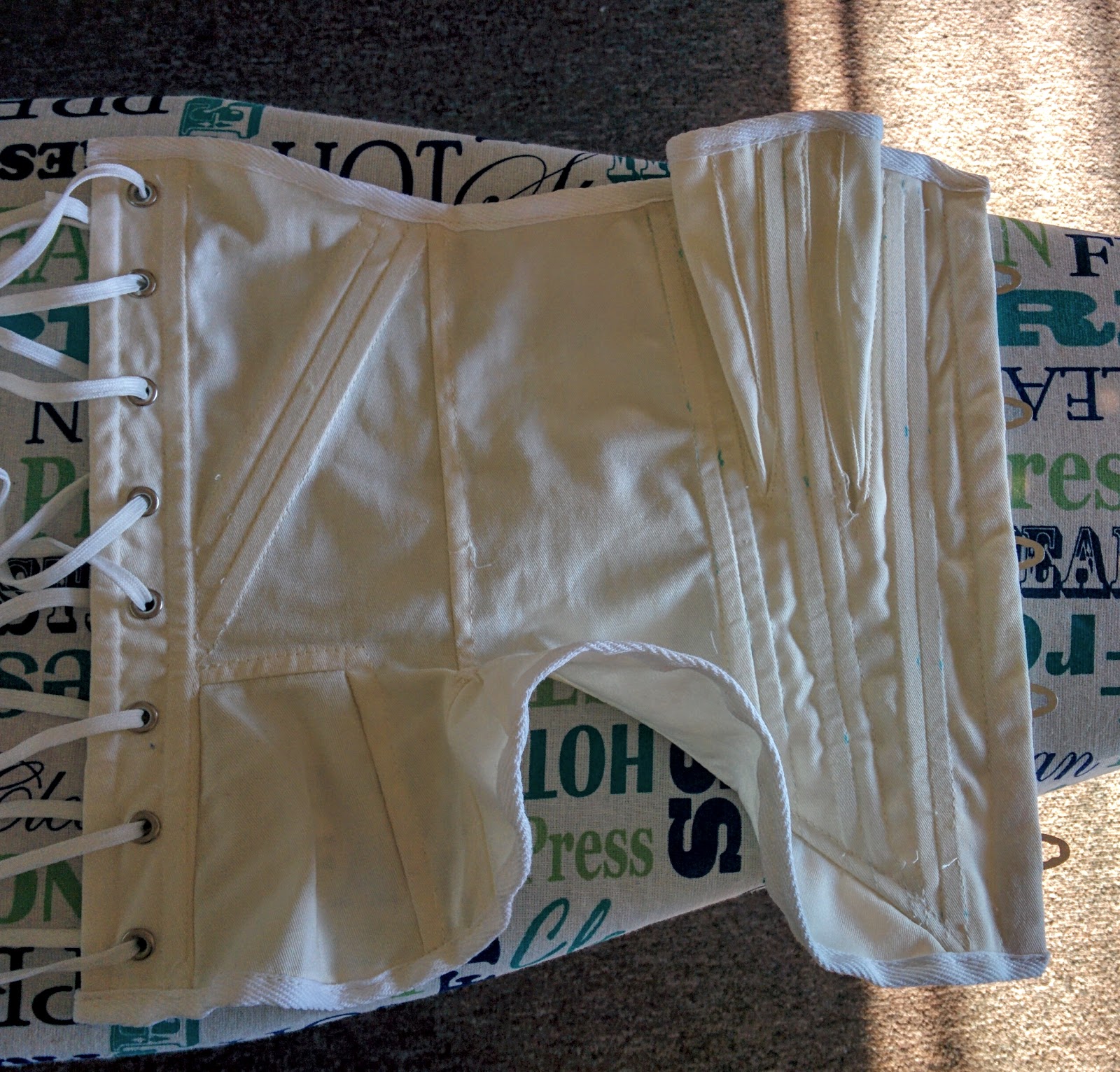 Fabric/Materials: Off-white cotton twill from my corset stash and heavy white twill tape. Originally I was going to cover it with satin, but in the end I’m glad I decided to make this a wearable mockup, as the pattern needs a little tweaking.