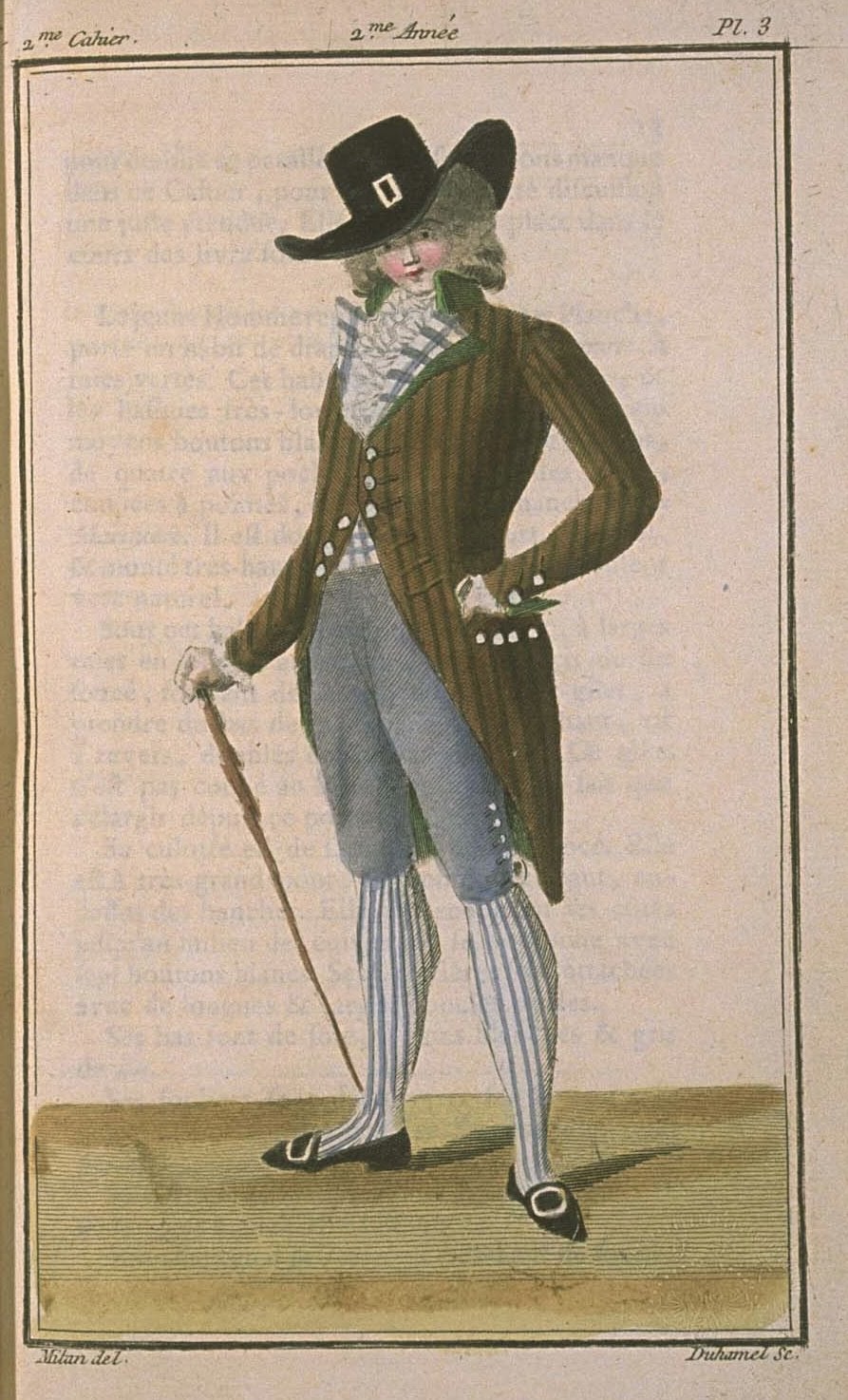 May young people not follow the fashion of the cramped and stiff attitude of the young Englishman shown in this Plate; may they feel that this young man lacks the liberty, the ease which makes grace, that the French possess more than any other Nation, and which must be recherchée at least by all the Votaries of Fashion. We only give English Fashions in order that those who will desire it will adopt the costume, which does not allow being piquant, but never in order for them to adopt the discomfort, the contortion, which would give, it is true, a foreign air, but not an agreeable and seductive one.