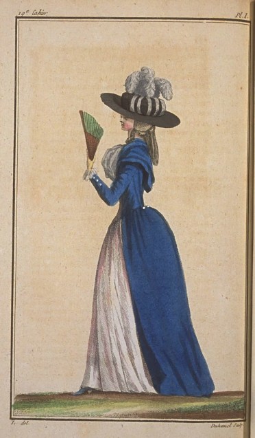 Woman in a blue redingote with white/pink petticoat, 1786; Cabinet des Modes, 19e Cahier. 1ere Figure (2)