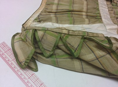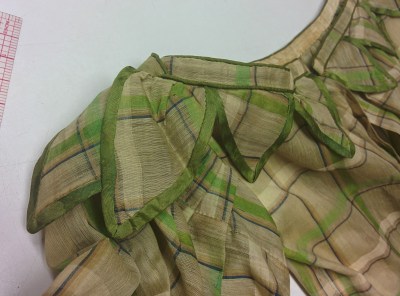 While the original was a very sheer cross-barred/checked silk, I used a semi-sheer madras cotton check. It’s not a perfect substitution, but the fabric was a good price and it’s still got a very light hand, so I don’t think it’s inappropriate to combine with a lightweight silk for piping/binding.