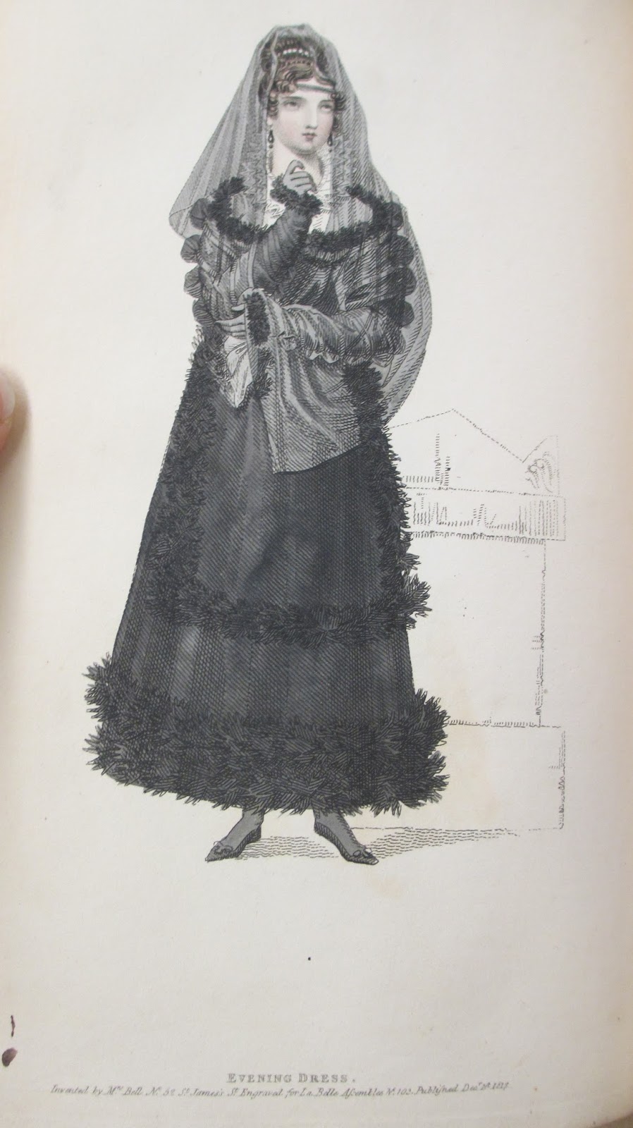 Walking dress and evening dress in the general mourning for Princess Charlotte, La Belle Assemblée, Nov. 1817