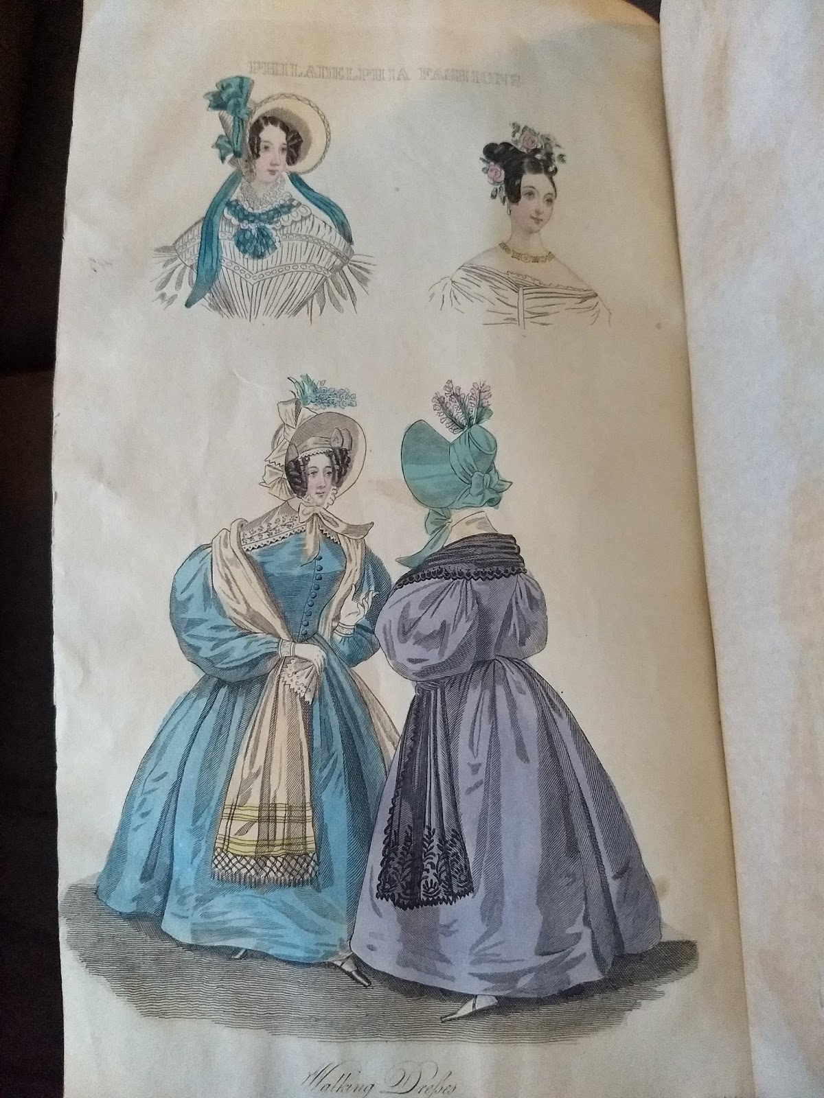 Hats are mostly made of India silk, the colour according to fancy – dresses to please the taste of the wearer, made after the manner of the engraving. – Artificials are mostly used, thought some prefer feathers.