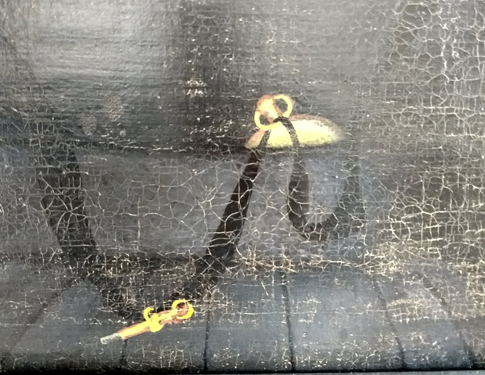 A dark-colored gown is very common on sitters in folk portraits, but it’s not always so common to see this much detail! Quite often, the dress is a kind of dark mass that sets off the whitework on the cap and pelerine. Here, we can see that the bodice has what was known as a “Sévigné” drapery across the bust, or was made à la Sévigné – named after a seventeenth-century portrait of the Marquise de Sévigné. The neckline is quite open, which was common on day gowns of the early 1830s. Her sleeves are very full and gathered or narrowly pleated to the low armscye, then caught again an inch or so below it: a method for controlling fullness at the sleeve head that would become very common later in the decade. The gown’s waistline is a bit raised, and covered with a matching belt.
