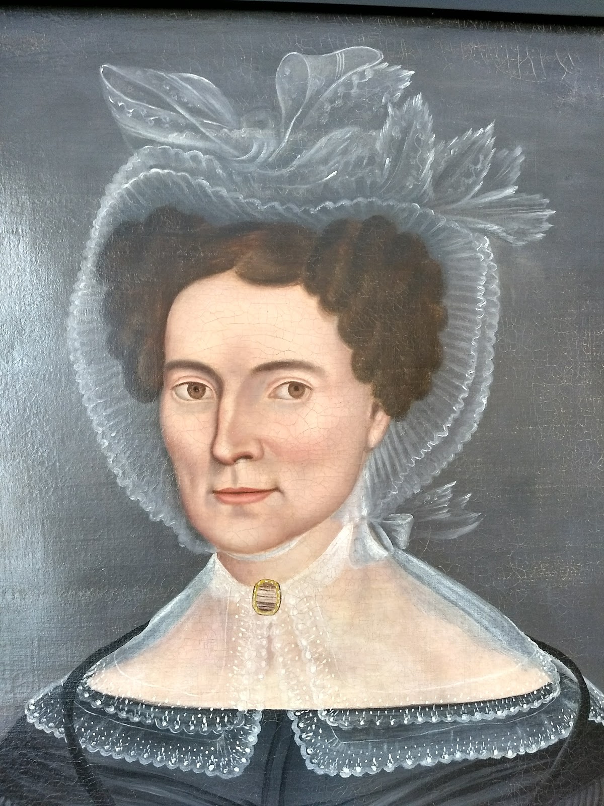 This portrait was initially purchased by the museum at Sotheby’s in 1988 as “Clarissa Moody Wright in her wedding bonnet”. Let’s really dig into the clothing on view here, and then I’ll talk some more about why this piece is of such interest to the SLCHA.