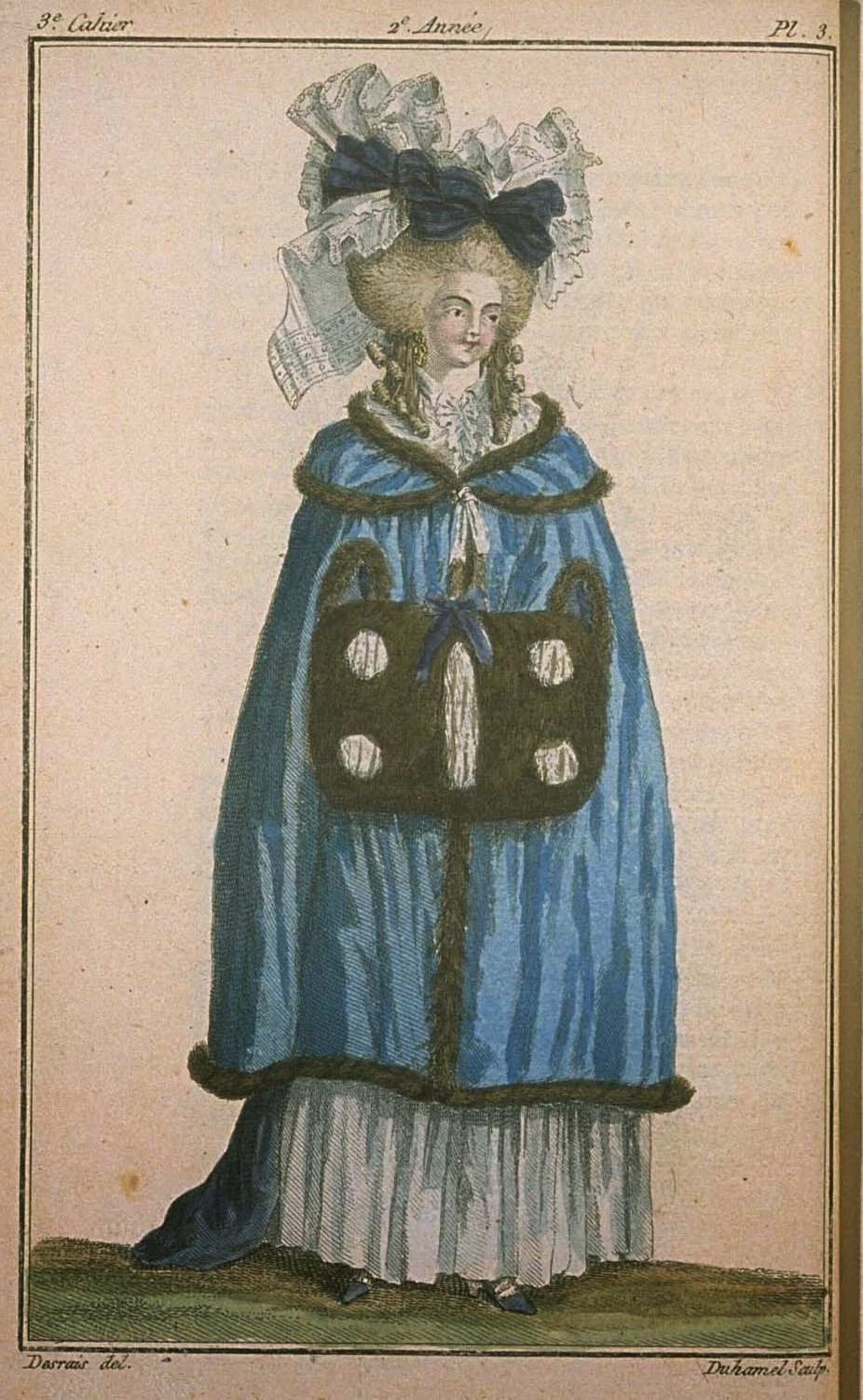 For showing winter dress, it would not suffice to give a Lady fully dressed in a satin gown (1); it would be even worse to show her covered with a pelisse and carrying a muff, to have the full dress. The former would show the effect of the gown, uncovered by the pelisse, and in the way that she would appear at an Assembly; but the latter would show the full outfit, and in the way she would appear in a Promenade or at the Spectacle. The former was necessary for the purpose; the latter is no less so. The practice of wearing pelisses does not survive with as much strength as in previous years (the fashion of mantelets, and, even more, wool redingotes, have given it a rude push!), but it is not past: one could say that at present one is still not fully dressed without a pelisse. Thus it is necessary to show a Lady covered with a pelisse and holding a muff.