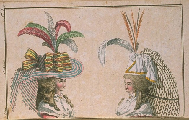 The second, also dressed in a pink satin gown, is frizzed like the first, but without powder, having a kerchief matching that of the first, wears a cap à la Bayard, such as the Actress wore in the Theatre, and such as the women of this City originally wore. One sees that, as we said in the first Book, they are only a sort of turban whose crown is raised into a sugarloaf; that they are trimmed in front with gold fringe, and behind with a long crêpe of gauze, with black and white stripes. On the front of this cap rises an aigrette of black and flame-colored rooster plumes, and a large white plume which falls floatingly.