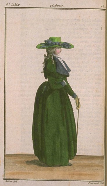 The Englishwoman drawn in PLATE I wears a man’s redingote of olivish wool, with three wide collars falling very low to below the shoulders, with large revers lined with violet satin, with violet satin cuffs, and trimmed on the cuffs, on the hips, and on the fronts with wide white mother-of-pearl buttons. A sort of belt of the same wool, trimmed with the same buttons, binds this redingote from the front in the manner of German redingotes. This is the only addition at present which differentiates the former English redingotes from the current French ones.