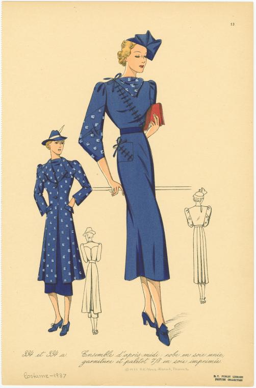 | “Afternoon suit: solid-colored silk dress, trim and 7/8-length overcoat in printed silk”, 1937; NYPL |