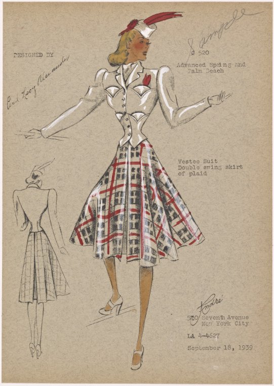 In 1938, however, the skirt was shortened to hit below the kneecap, while high fashion in 1939 added flare to the hem. The width of the outfit at the shoulders and knees was balanced by a narrow waistline – the silhouette was an hourglass.