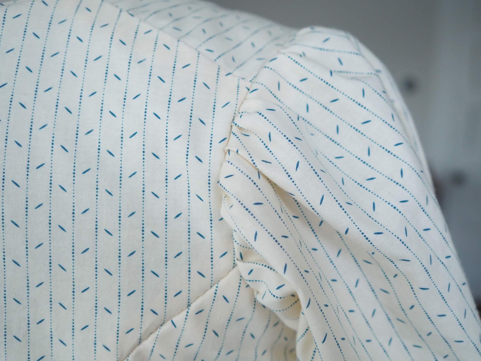 The back and sides of the bodice are lined in linen. The curved side-back seams are sewn with the still-unnamed but very helpful stitch that lets you sew lining and outer fabric in the same seam while hiding the raw edges (as the original was – the other pattern has the lining made up first and the cotton topstitched over it), but I sewed the shoulder seams separately in both layers.