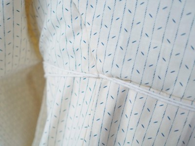 The top of the sleeve is very simply gathered and then sewn to both layers of the bodice. What’s interesting about the sleeve – to me, anyway – is that it’s cut with the front side of the seam on the straight and the back on the bias, so when it hangs empty on the dress form it actually ends up curving forward as though it were made to accommodate a bent elbow.