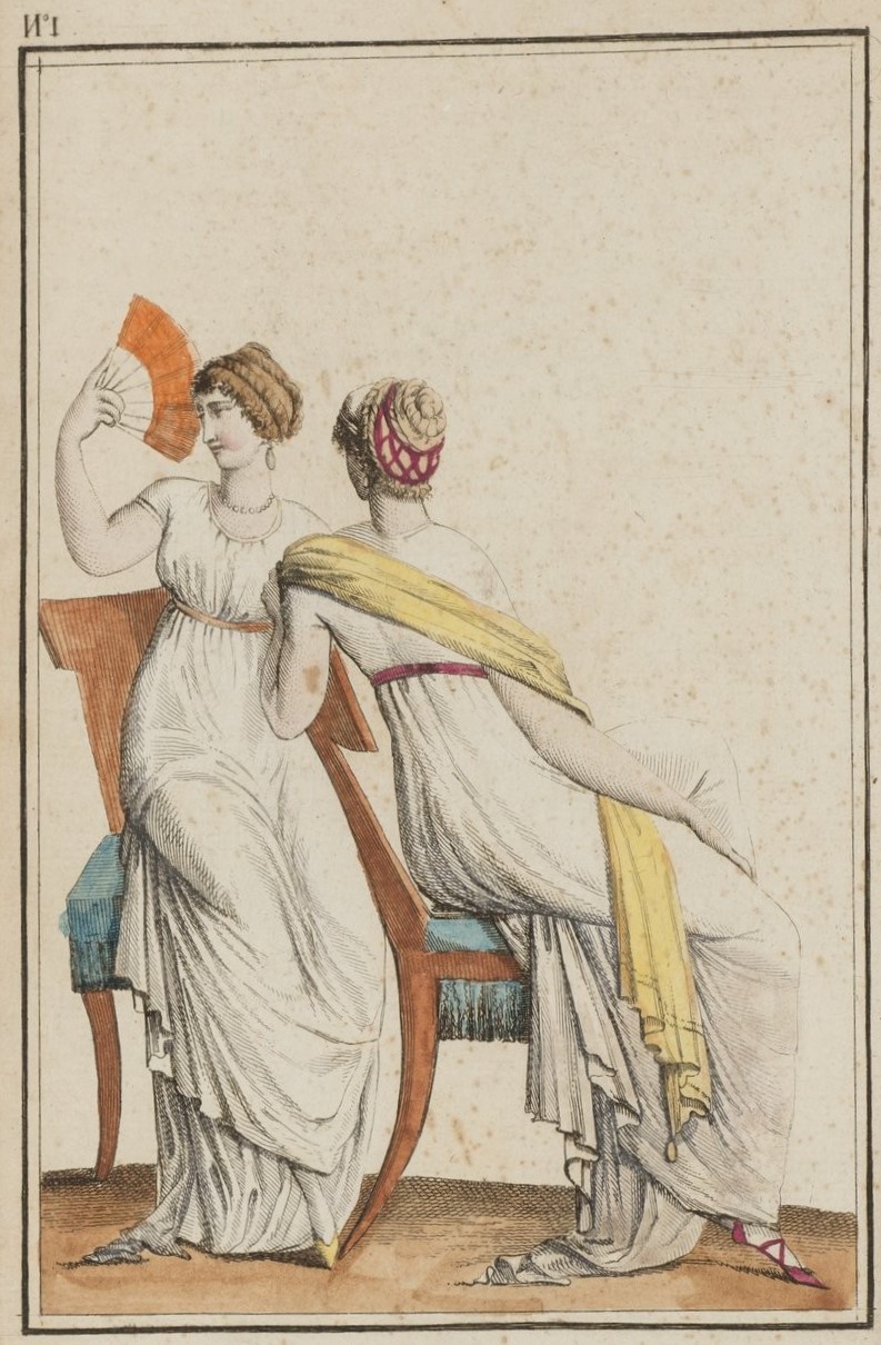 This coiffure imitates the antique, and goes with their dress. It is not rare, though it is ridiculous, to see undress caps, velvet hats, cornettes of linen gauze, satin bonnets trimmed with plumes, toques of bouillonnée gauze, turbans topped with a feather – one or another of these modern headdresses decorating the head of a woman in a tunic, in cothurnes,* and draped à la romaine. This discrepancy shocks good taste, but to each her own, and the proverb is right.