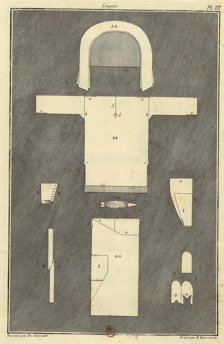 A fabric three-quarters of an ell wide is used, with an ell and a quarter required for one body, which is folded in half on the length. A pair of amadis sleeves are taken from the width, and a quarter ell for all of the furnitures which will be added, like a man’s shirt, see after. In all, three and five-eighths ells are needed for two full shifts.