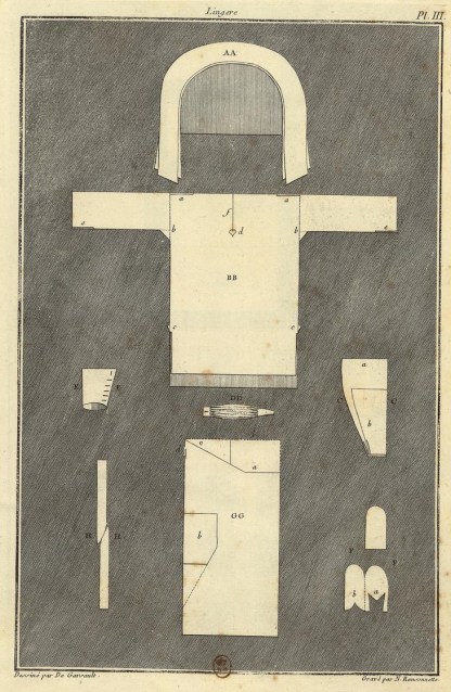 In a linen or double muslin just about fifteen-sixteenths of an ell wide, a length of five-sixths of an ell is cut for twelve caps. Four crowns are made from the width, in the same proportion of those of the cornette above; and for the crowns and brims of said twelve caps, a length of an ell and a twelfth. The brims will be two and a quarter inches wide, and five-eighths of an ell long. A band and a half are made in the same width of a clear muslin: the under-bands will be three inches wide and five-sixths of an ell long; the over-bands are two inches wide and a foot and a half-inch long.