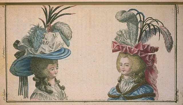 The Woman dressed in a pink satin gown wears a hat à l’Espagnole. This hat is of a soft blue sain. The crown, called l’Espagnole, is of a white satin and very puffed. It is wrapped with a wide ribbon, with lilac, white, and blue stripes, which forms a large bow behind, whose two ends hang very low. This hat is surmounted with three large plumes, of which two are blue and one is white, and with an aigrette of rooster feathers, tinted at the ends with flame color.