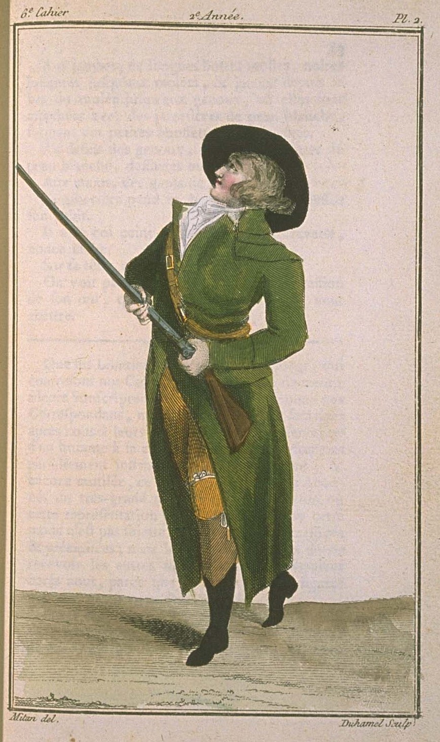 The dress of the Englishman shown in this Plate is a great redingote of bottle-green wool, with very long skirts, very short waist, and three collars. This redingote is without buttons, and is only fastened with pins.