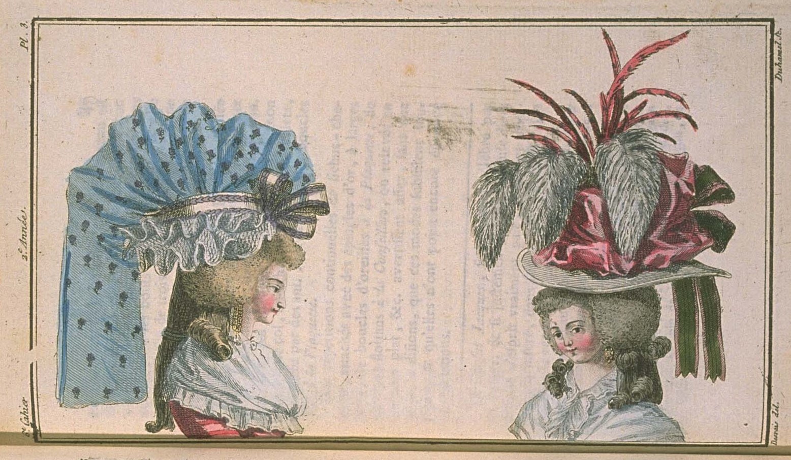 The other Woman wears a hat à l’Espagnol, in which satin. (1) The crown of this hat is of pink crêpe. This crown is tied with a purple and pink ribbon, forming a large bow in the back whose ends hand very low, and it is surmounted by three white plumes and a rooster aigrette, dyed flame-color.